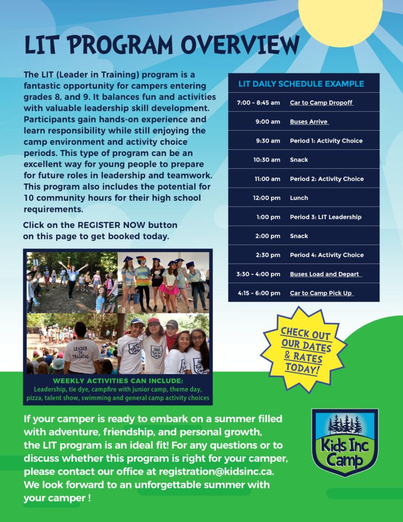 The Kids Inc Leader In Training (LIT) program is for campers who are entering grades 8, and 9 (campers entering grade 10 might be eligible – please contact our office to discuss). This program develops and enhances invaluable leadership skills for all participants. It has been crafted to provide balance between responsibility and fun by giving teens the opportunity to learn new skills, while continuing to participate in recreational camp activities.